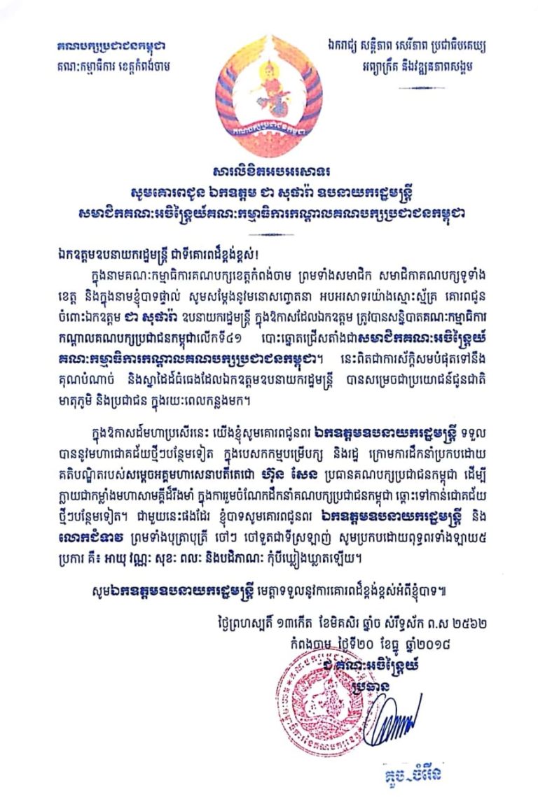 សារលិខិតអបអរសាទរ សូមគោរពជូន ឯកឧត្តម ជា សុផារ៉ា ឧបនាយករដ្ឋមន្ត្រី សមាជិកគណៈអចិន្ត្រៃយ៍គណៈកម្មាធិការកណ្តាលគណបក្សប្រជាជនកម្ពុជា Posted on ថ្ងៃ សុក្រ, 21 ធ្នូ, 2018Friday, 21 December, 2018 by Lor Sovanney