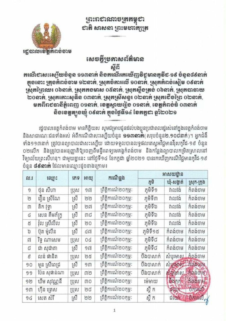 រដ្ឋបាលខេត្តកំពង់ចាម សេចក្ដី ប្រកាស ព័ត៌មាន ស្តីពី ករណី អ្នកវិជ្ជមាន កូវីដ -១៩ មានចំនួន៨៩នាក់ និងអ្នកជម្ងឺជាសះស្បេីយ១១៣នាក់ ក្នុងថ្ងៃទី១៤ ខែកក្កដា ឆ្នាំ ២០២១។
